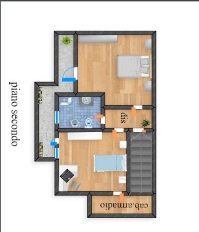 Le caratteristiche principali di questa soluzione sono l'ampio salone con camino che si apre su una spaziosa cucina abitabile, le due camere da letto accoglienti, la pratica lavanderia e i due bagni.
