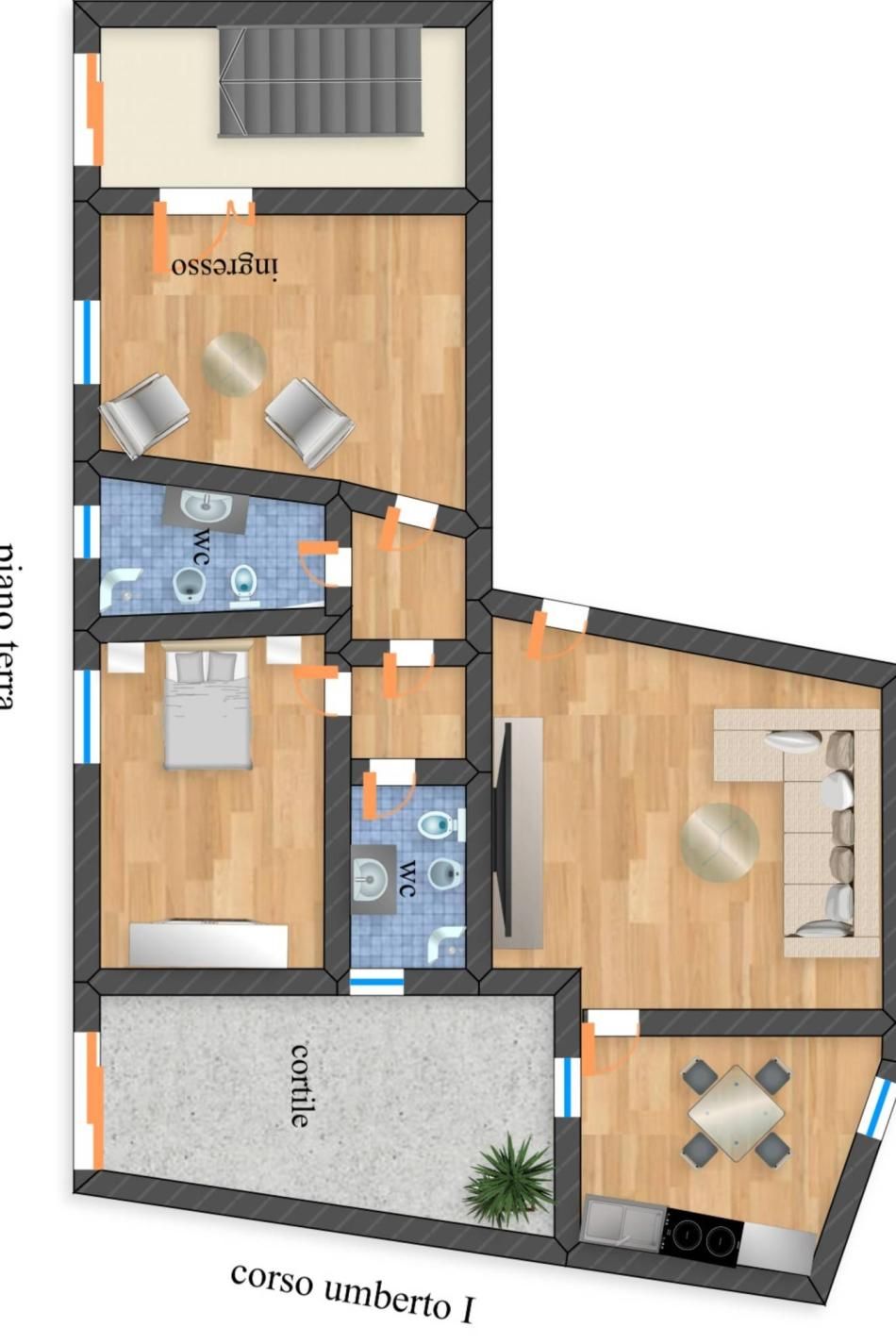 Al Piano Terra: 120 m² di appartamento, perfetto per accogliere una famiglia più grande. Comprende due ampie camere da letto matrimoniali, due bagni, un ripostiglio capiente, un ampio salone e una cucina abitabile.